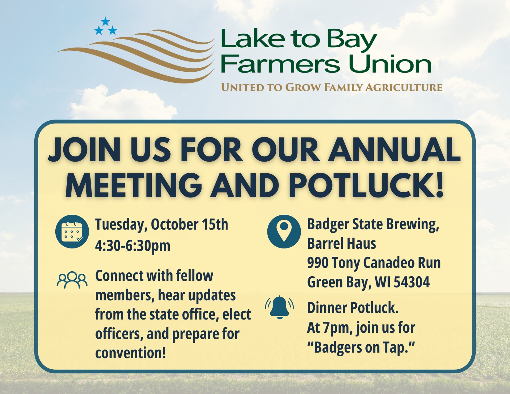 Join us at the annual meeting and potluck on Tuesday, October 15th from 4:30-6:30pm at Badger State Brewing Company.