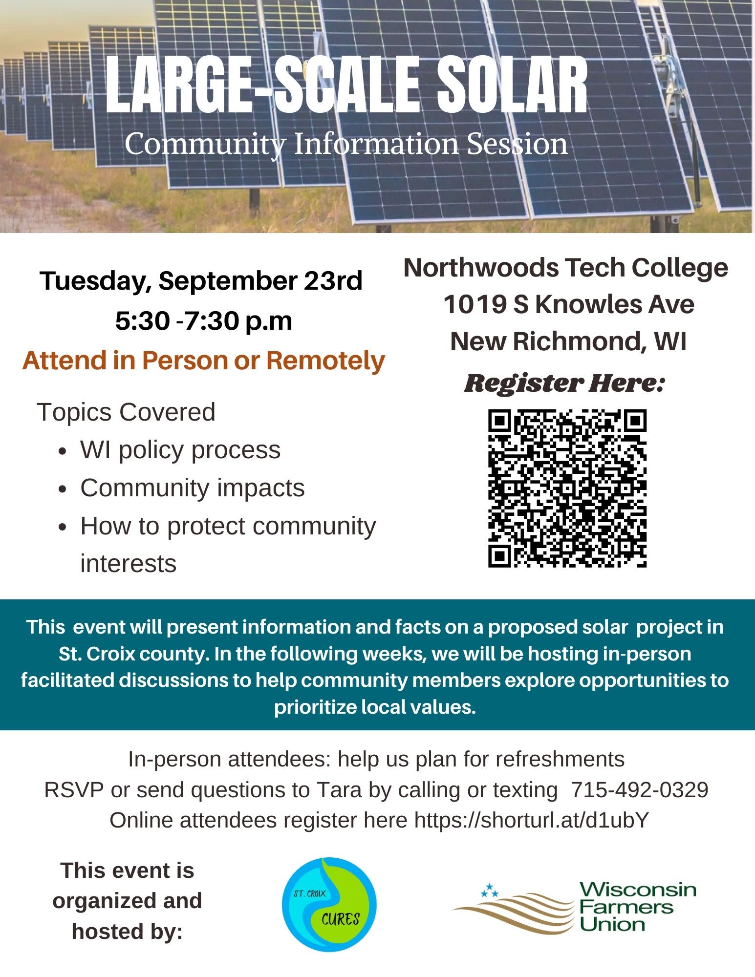 We plan to host facilitated discussion sessions in the weeks after this event for communities who are interested. Where there can be discourse to consider how communities can leverage the best outcomes possible for all members. This event is hosted by the Wisconsin Farmers Union in partnership with St. Croix CURES - we will be notifying Xcel Energy staff of the event but this is not an Xcel Energy hosted event and we cannot guarantee they will be present to answer questions.