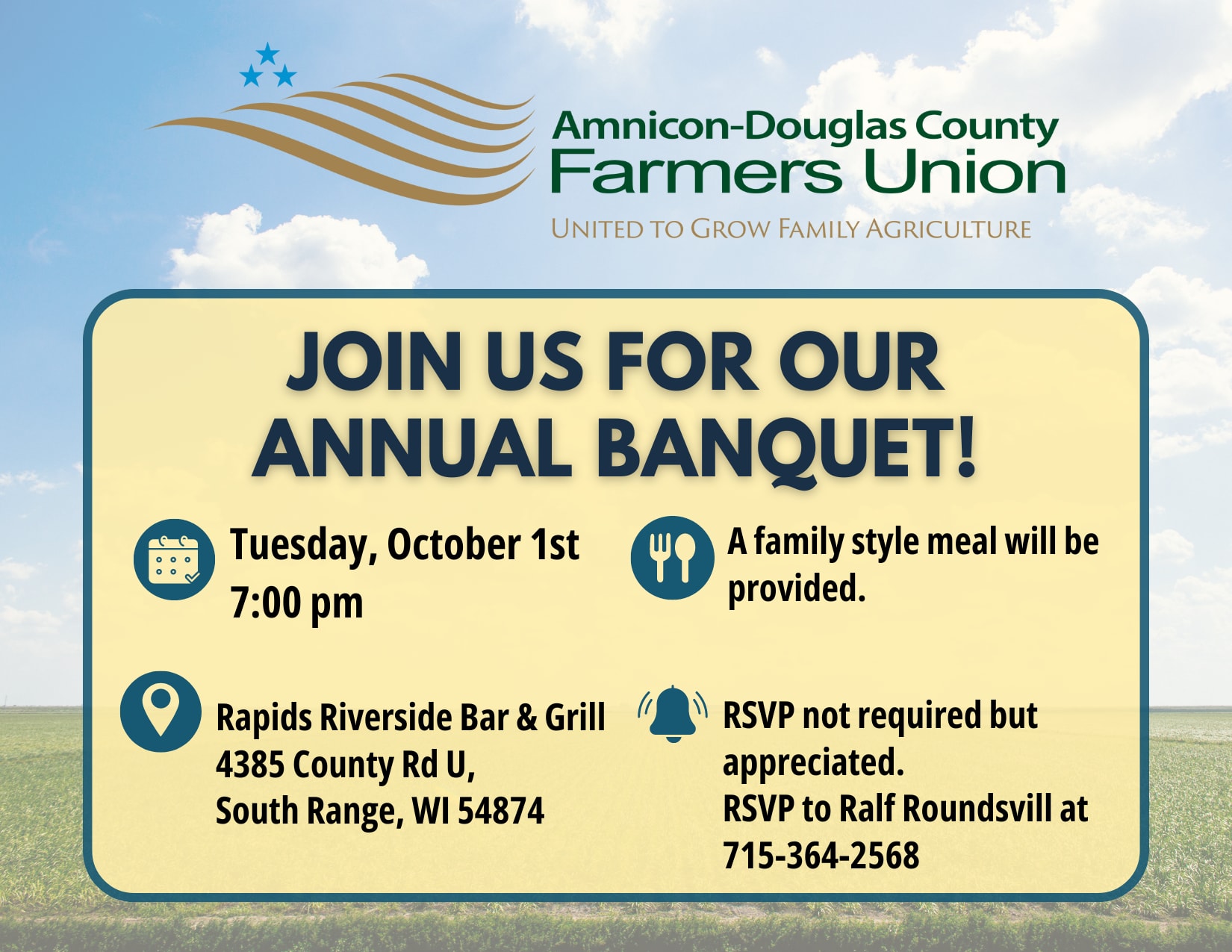 Please join us for dinner to connect with fellow members, hear updates from the state office, elect officers, and prepare for convention at the Amnicon-Douglas County Annual Banquet!  A family style meal will be provided.