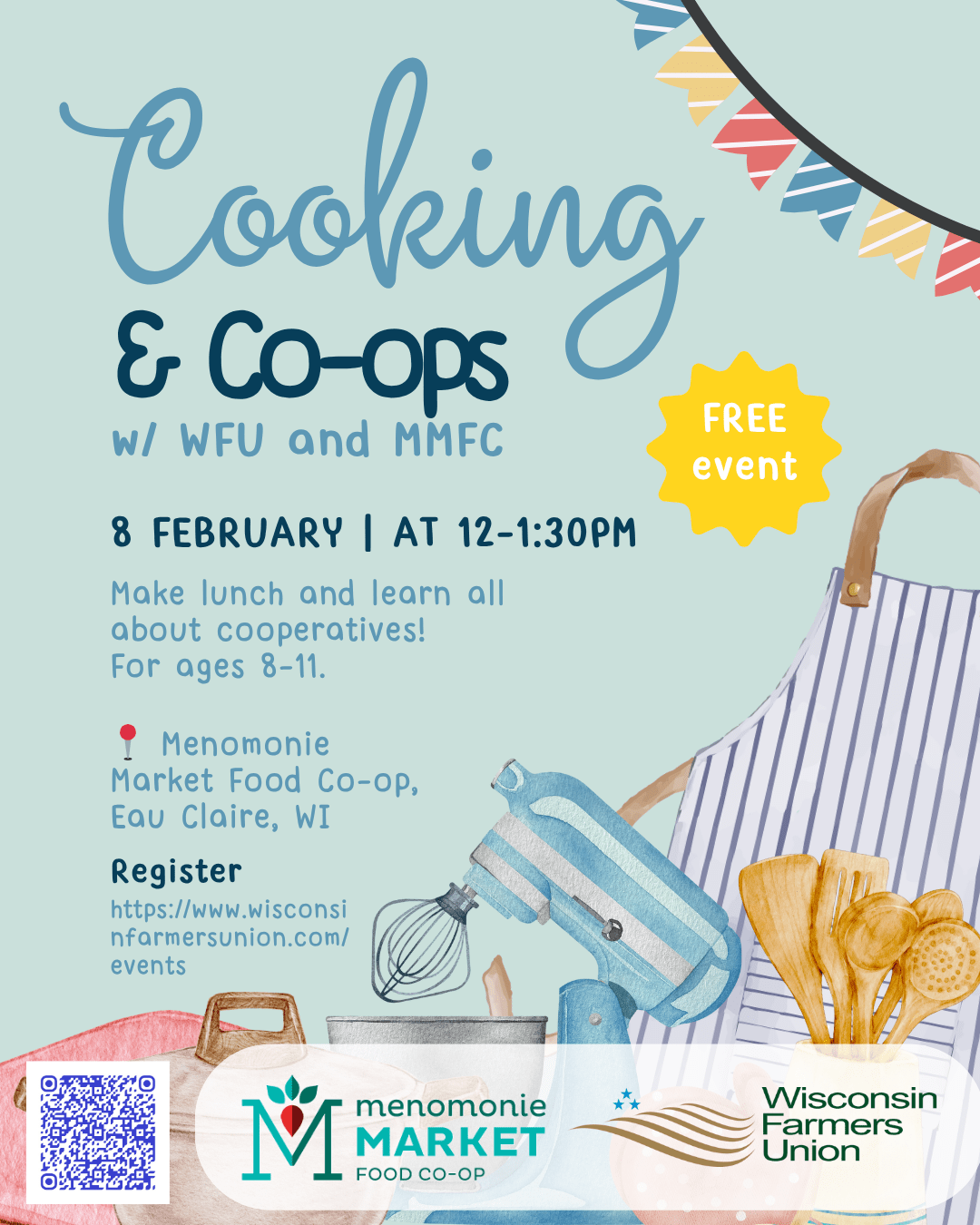 Join WFU and MMFC at Menomonie Market Food Co-op in Eau Claire for an afternoon of fun! Learn all about co-ops and make a delicious lunch in the co-op kitchen. Registration is free and required, open to ages 8-11.