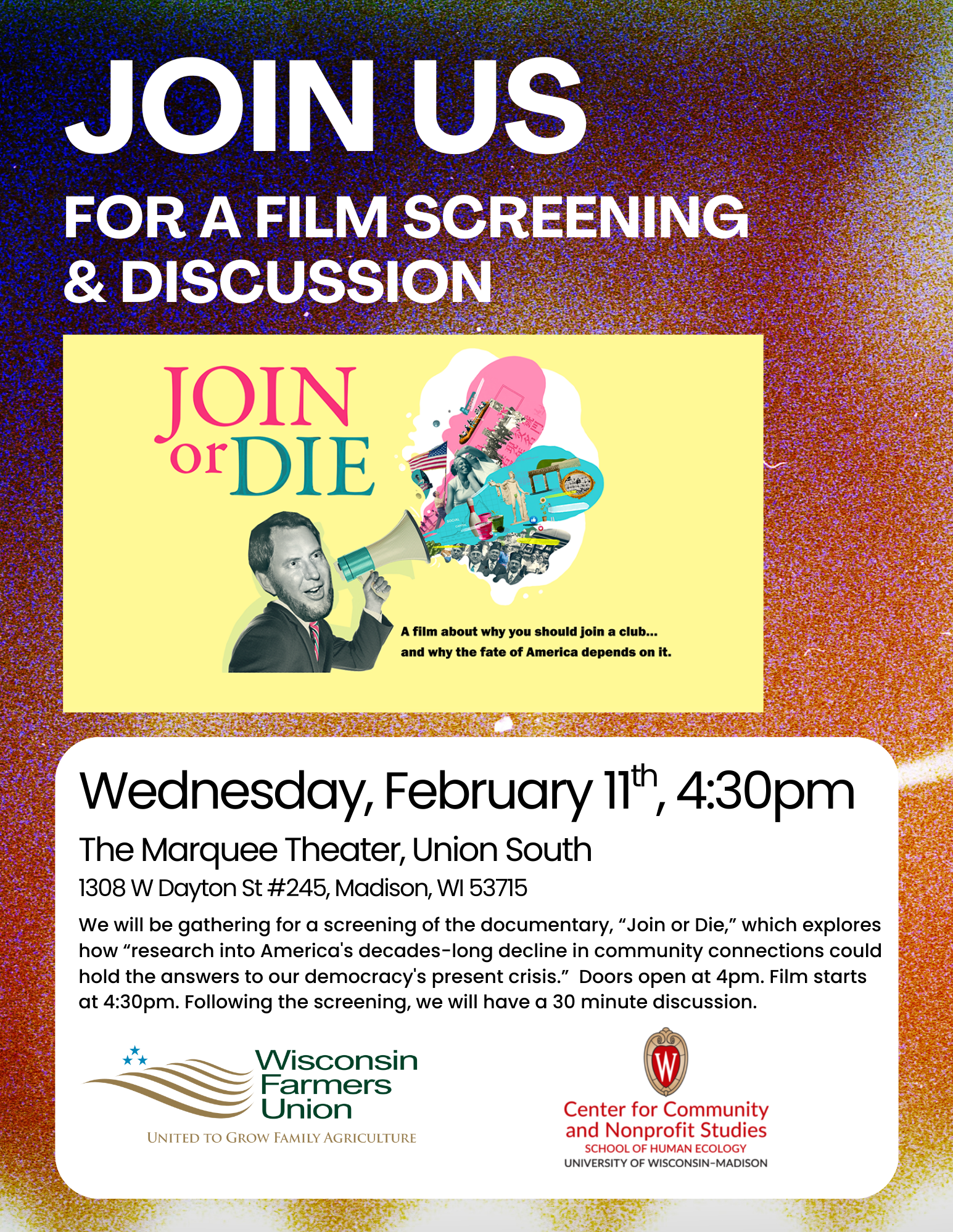 Co-hosted by Wisconsin Farmers Union and The Center for Community and Nonprofit Studies. All are invited!