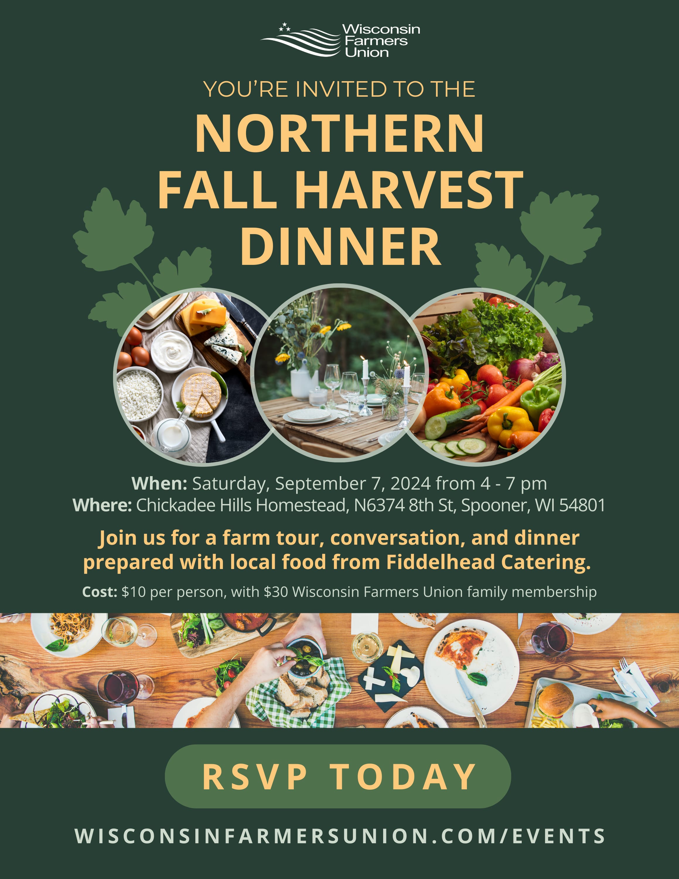 You’re invited to a Fall Harvest Dinner hosted by Wisconsin Farmers Union on Saturday, September 7, 2024, from 4:00-7:00 pm and the beautiful Chickadee Hills Homestead. The meal will be food sourced from Wisconsin and WI Farmers Union members.