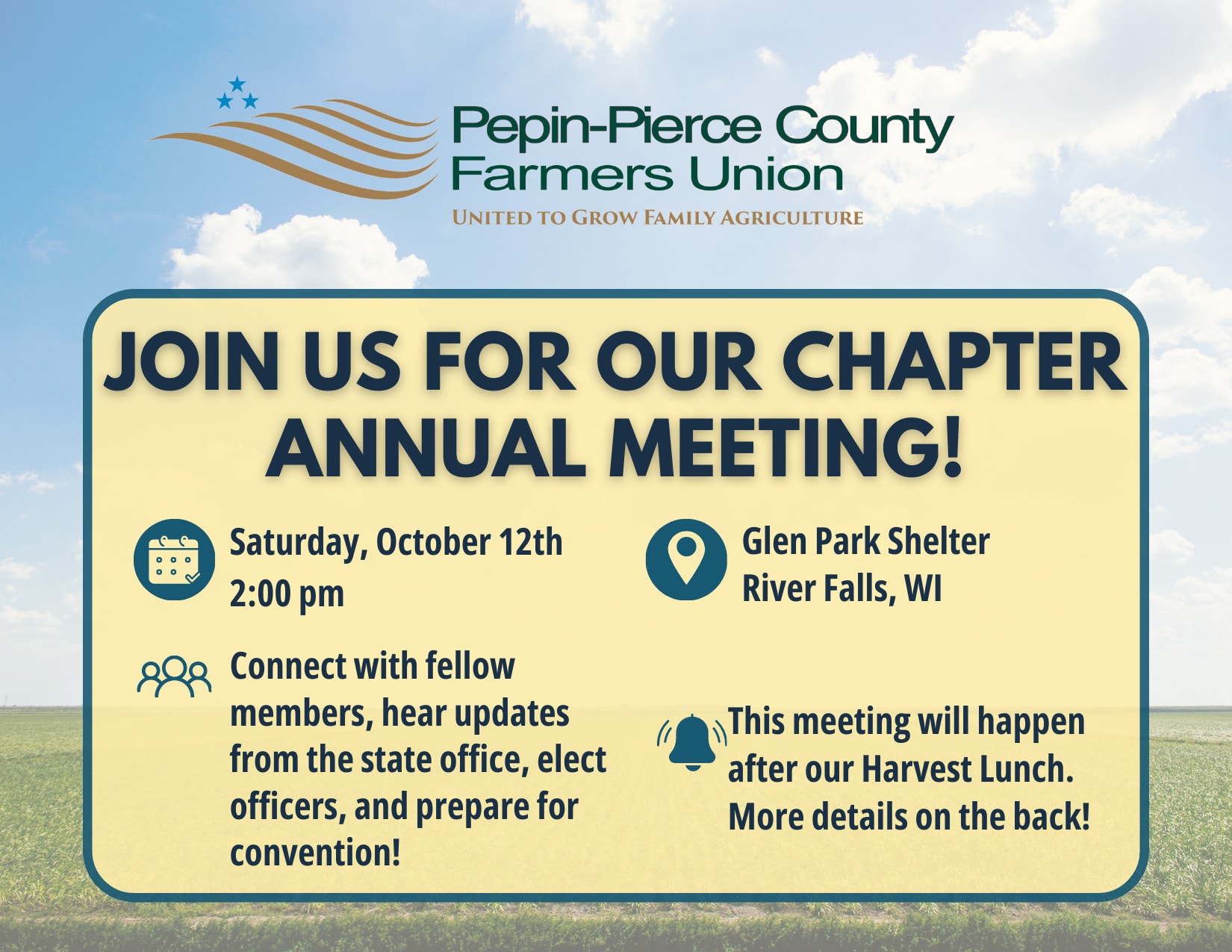 Our Annual Meeting will take place after our Fall Harvest Lunch event that we are hosting in combination with the WFU St. Croix Chapter. We invite you to also join us for a delicious local lunch prepared by Chef Steph. Learn about the activities Wisconsin Farmers Union is working on that affect us all and how you can help. Michelle Ramirez-White, Government Relations Director from WFU, will talk about the Farm Bill and what it means to all of us.   Registration for WFU members is $10. Kids 8 and under register for free.  You can learn more register for our Luncheon here: here