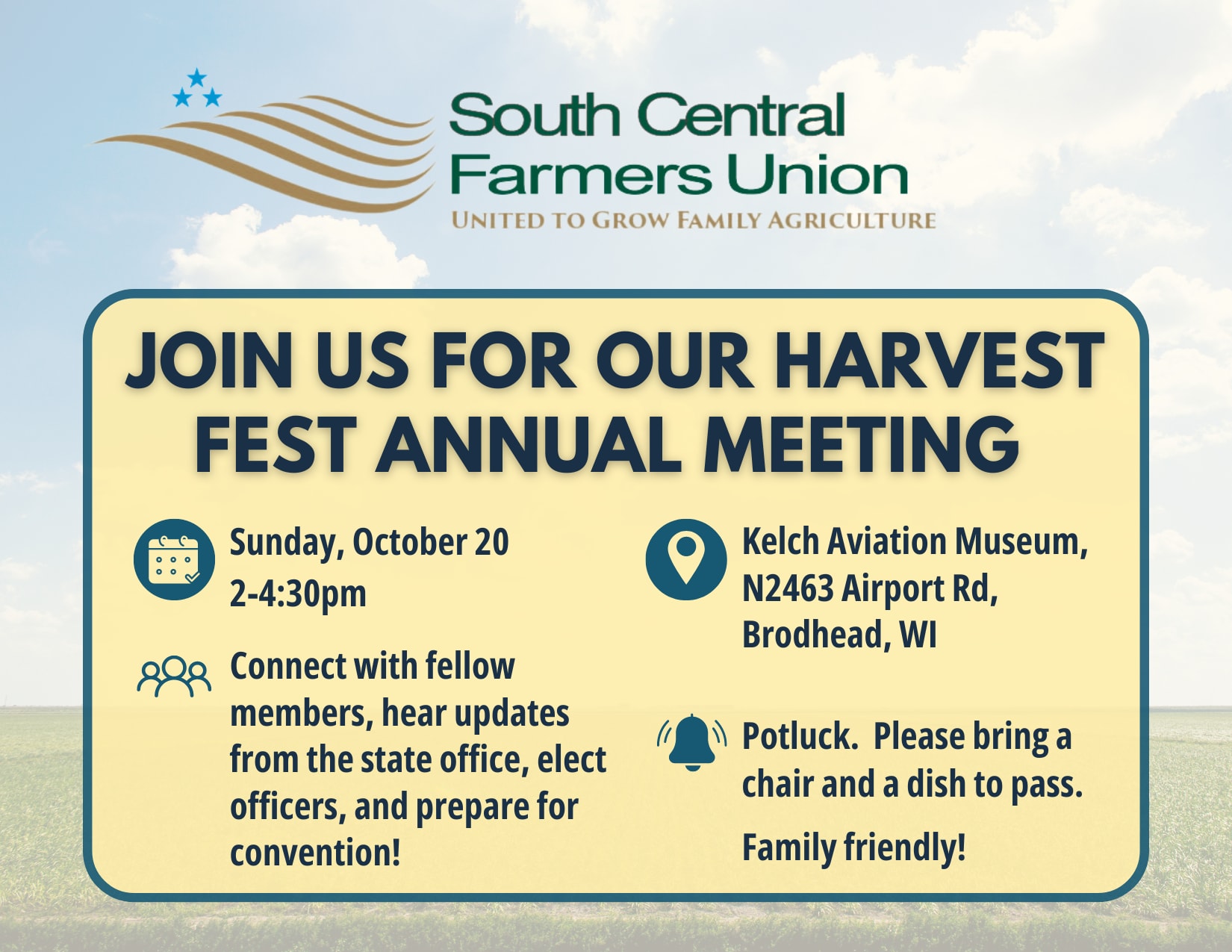 Join the South Central Wisconsin Farmers Union Chapter on Sunday, October 20th for the Harvest Fest Annual Meeting at the Kelch Aviation Museum.